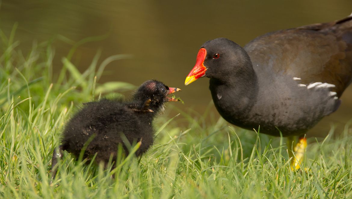 Jonge waterhoentjes helpen hun ouders vaak met het verzorgen van kuikens uit een later nest. Ze zijn bruin, in tegenstelling tot de ouders die erg contrastrijk zijn met hun zwarte veren en rode snavel.