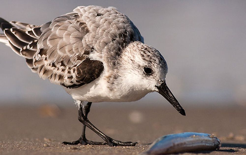 “Toen zagen we er één die bijzonder gedrag vertoonde bij een zandspiering. Elke keer als er andere strandlopers in de buurt van die spiering kwamen, was deze er als de kippen bij om ze te verjagen. Soms rende hij zelf ook weg als de spiering in het zand opwipte. Maar als een andere vogel in de buurt kwam, was hij er ook weer. Met bolle rug én een bepaald geluid kwam hij aanrennen. Ik lag op mijn buik in het zand en hoefde alleen maar de spiering in de gaten te houden. Als ik dat geluidje hoorde, wist ik dat de drieteen eraan kwam. Zo heb ik een aantal mooie beelden kunnen maken.”