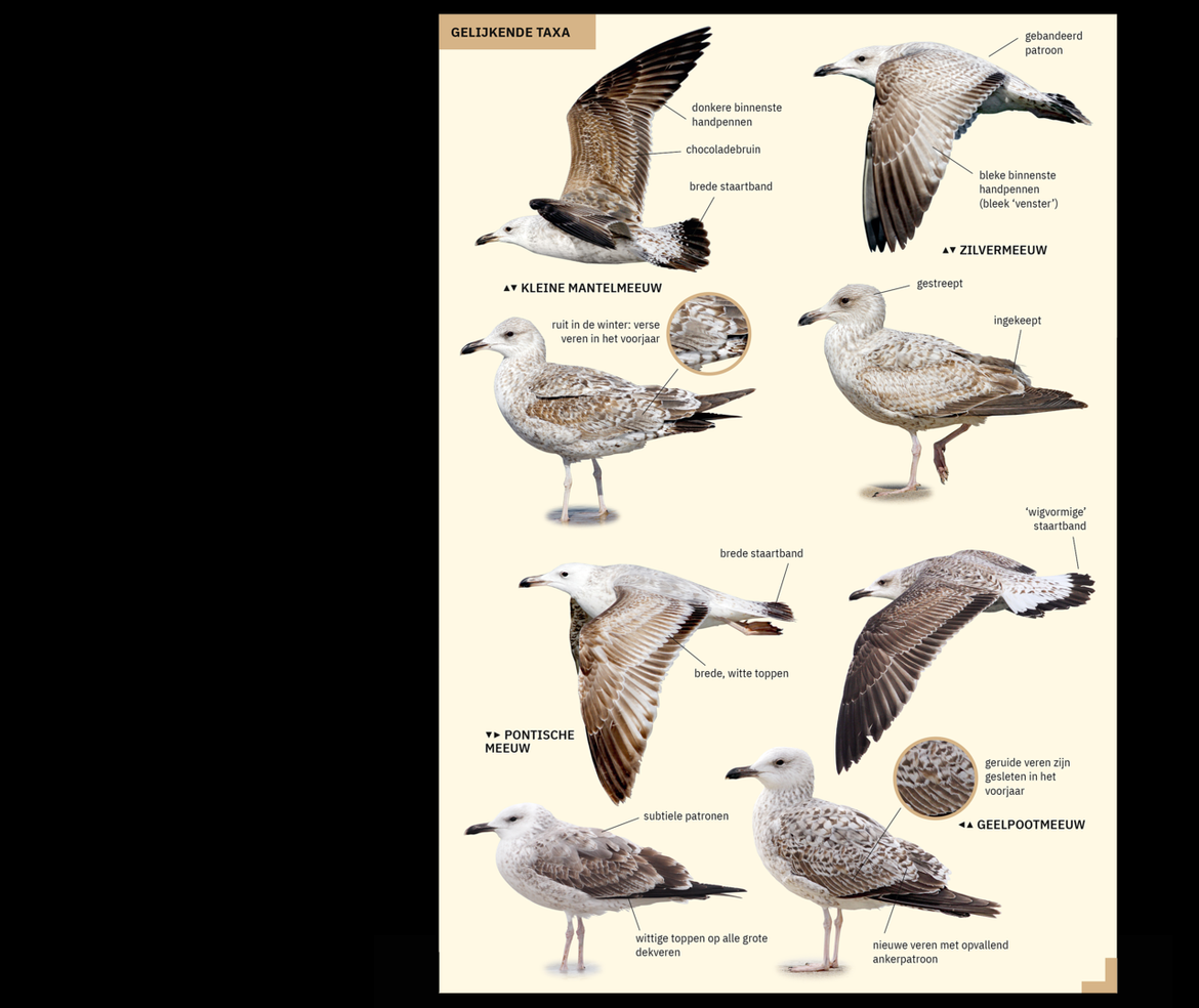 In de bijbehorende tekst worden de overige kenmerken benoemd. Om de soortbesprekingen tot de essentie te beperken, worden leeftijdsbepaling en rui - belangrijk bij (meeuwen)determinatie -  vooraf uitgebreid behandeld, in de inleidende hoofdstukken. Erg handig is ook dat bij iedere soort per leeftijdsklasse vergelijkingen worden gemaakt met de meest gelijkende (onder)soorten, in aparte blokjes. De soortteksten bevatten verder actuele informatie over voorkomen en verspreiding.