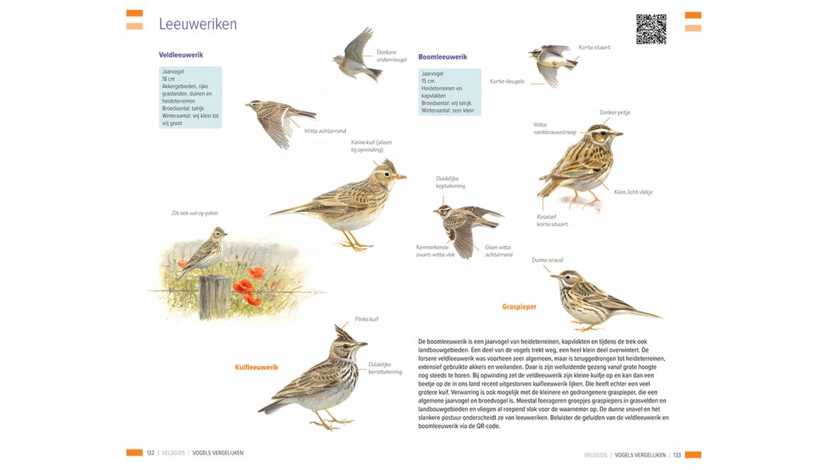 Ieder duo (of trio, tot soms kwartet) van vogelsoorten wordt bovendien in tekstblokken behandeld. Hier komt ook aan bod waar en wanneer de vogels te zien zijn. Dit kan al goed helpen bij de herkenning. Ook zaken als gedrag, vliegwijze en overige veldkenmerken worden besproken, evenals de (vaak ook onderscheidende) geluiden. Die laatste zijn trouwens te beluisteren via QR-codes bovenaan de pagina.