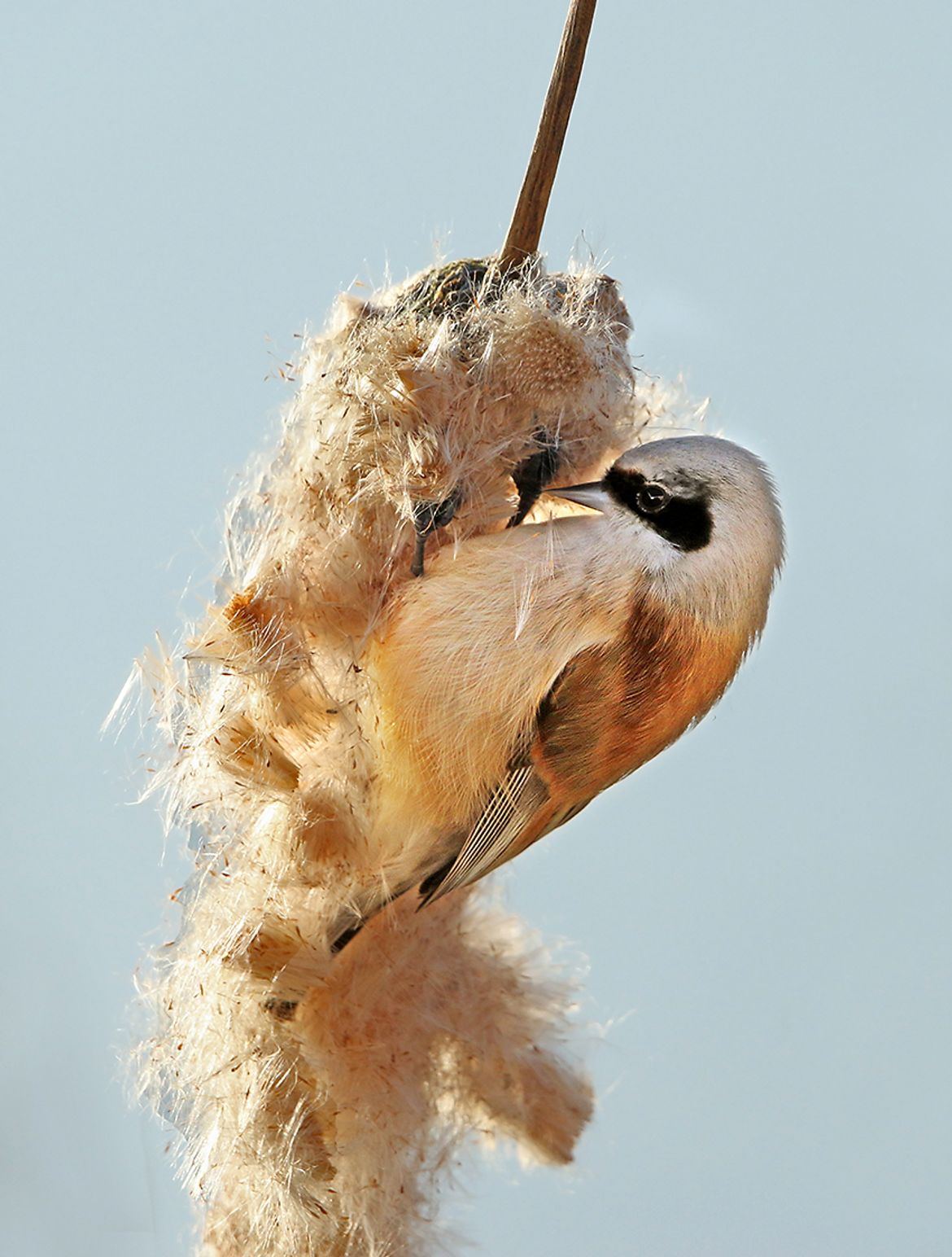 Ondanks hun nabijheid en redelijke tamheid was het maken van foto’s niet makkelijk. Ze zijn zeer bewegelijk, vliegend van rietstengel tot rietstengel, snel pikkend op zaden en kleine beestjes in een zelf gecreëerde wolk van de lisdoddepluizen. Het was daarnaast een mooie, heldere dag, wat helaas minder gunstig is voor vogelfotografie vanwege de scherpe contrasten. Bovendien scheen de zon vanachter de vogels. En om het nog lastiger te maken, bevond zich een woud van rietstengels tussen mij en de buidelmezen!