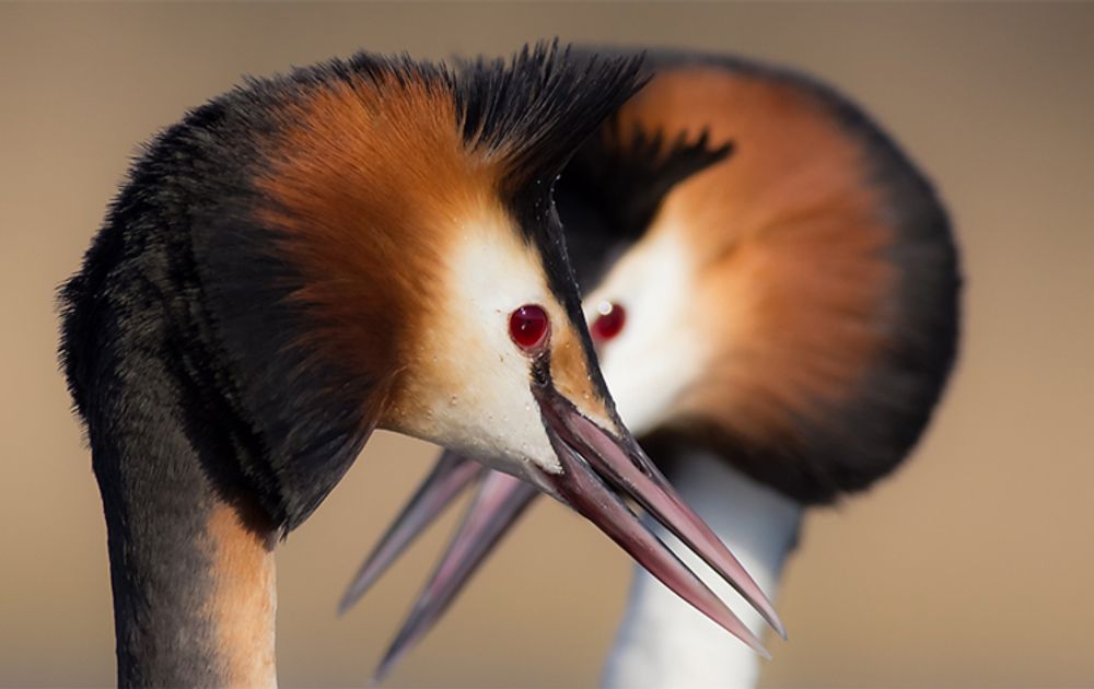 Een zeldzame broedvogel in ons land is de roodhalsfuut, zelden van dichtbij te zien. Ik weet het daarom nog goed: in het Vechtplassengebied bij Nederhorst den Berg hield in 1992 een paartje roodhalsfuten domicilie. We hielden dat met enkele vogelaars stil, wie weet zou het tot een broedgeval komen. Gewapend met telescoop en schetsboek heb ik uren genoten van de roodhalsfuten. In hun prachtkleed, compleet met kastanjebruine hals, zachtgrijze wangen en daarboven een heuse, zwarte toreadorsmuts voerden zij hun balts uit. Zeker, veel ingetogener dan die van de fuut. Ze bliezen hun rode hals op en richtten hun kleine oorpluimen op. Maar het geluid dat ze erbij produceerden…het balken van een ezel, daar had dit nog het meeste van weg! Uiteindelijk hebben we geen nest gevonden.