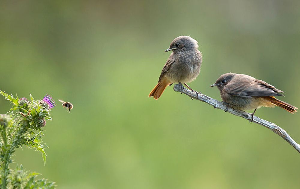 “En toen zag ik dit. Deze jonge vogels zijn pas twee weken uit het nest. Ze kijken gebiologeerd als twee natuurtoeristen naar de hommel die per toeval neerstreek zonder iets te doen.”