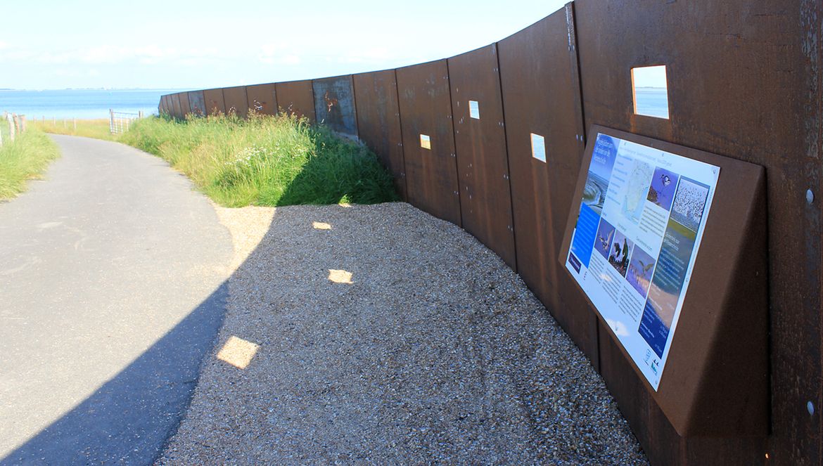 Het staat er inmiddels, twee meter hoog, met informatie over de plek en de vogels. En kijkgaten om soorten te zien als kanoet, zilverplevier, tureluur, bergeend, smient, wintertaling, wulpen dus en tijdens de doortrek lepelaars. Die kunnen nu in alle rust op hun plek blijven zitten, terwijl de fietsers ze mooi kunnen bekijken.”