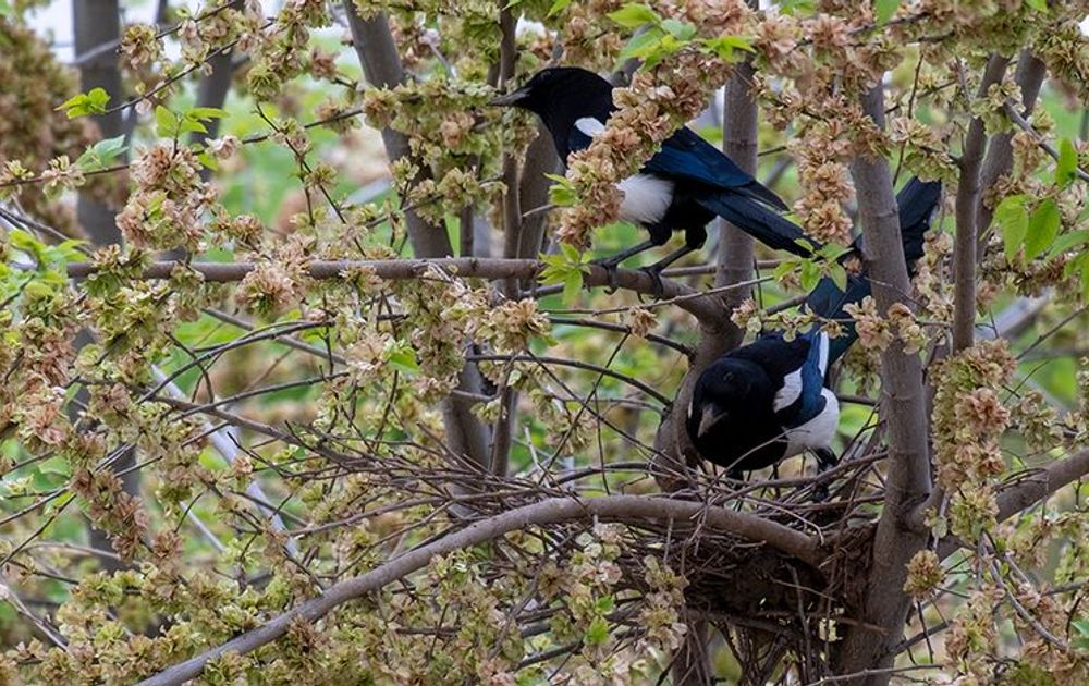 Eksters hebben wel een tijdje nodig om het nest te bouwen, soms enkele weken. Maar dan heb je ook wat. Ze beginnen met een vlonder van takken en twijgen die ze dan om de dikkere takken van de boom winden. Beide partners bouwen, maar vaak levert een van beide vogels materiaal aan dat de ander kunstig tot een kraamkamer vlecht. En dat gaat per toerbeurt.