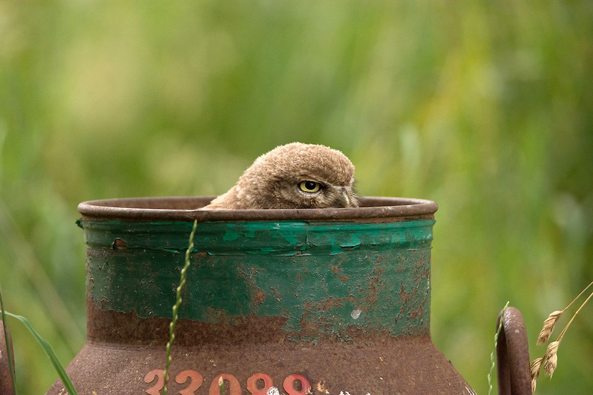 Vanuit de hut is elke hoekje goed te overzien en te fotograferen. Om hier te zitten en te genieten van de weldadige rust is al een belevenis op zich. Maar rust wordt ons weinig gegund. Twee uitgevlogen jonge steenuilen verkennen de omgeving en vragen continue om (onze) aandacht. Terwijl de camera’s klikken houdt pa of ma het kroost nauwlettend in de gaten. Het levert mooie plaatjes op. Naast onze hut verblijven collega-fotografen Desiree en Sigrid in een tweepersoons camouflage tent. Ze hebben het net zo druk als wij en ook zij beleven een prachtige middag.