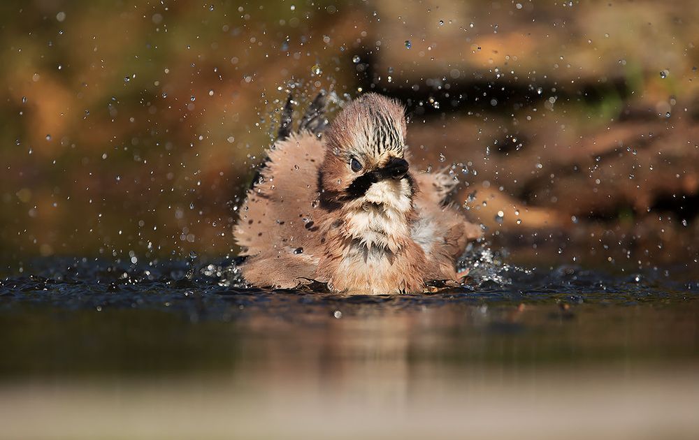 Je kunt hier een grote variatie aan bos- en heidevogels verwachten. Het gehele jaar is de kans op kruisbek, appelvink- en goudvink reëel, terwijl je in de trektijd ook verrassingen zoals beflijster en draaihals kunt verwachten. Wij brachten half september een lange ochtend in de hut door. Het was die dag warm, zodat veel vogels meer interesse hadden in water dan in voer. Het was grappig om te zien dat elke vogelsoort zo zijn eigen baadgedrag heeft. De grote bonte specht stapt voorzichtig in het water en vindt pootje baden al nat genoeg. De koolmees daarentegen houdt van een koude douche en spartelt als een jonge hond. Heel voorzichtig waagt de gaai zich ook in het water, maar houdt de omgeving angstvallig in de gaten.