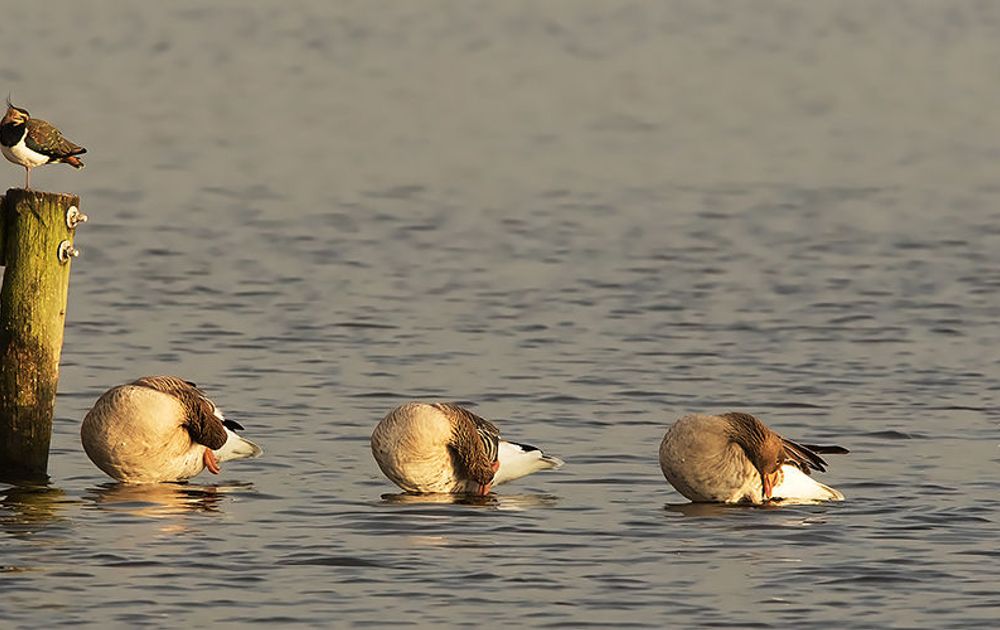 Op de plas verder futen in winterkleed, veel grauwe ganzen en brandganzen, smienten en zowaar drie brilduikers (vrouwtjes) en twee pijlstaarten (mannen). Op een eilandje wat verder weg, een groepje watersnippen.