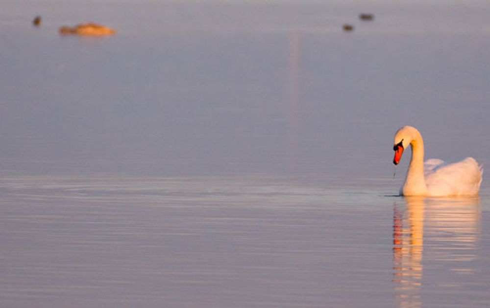 Op een meter of vijftig afstand zwemmen enkele aalscholvers en een familie knobbelzwaan. Niet meteen iets om voor uit je dak te gaan, maar de knobbelzwanen bieden in dit mooie ochtendlicht toch een sfeervol tafereel.