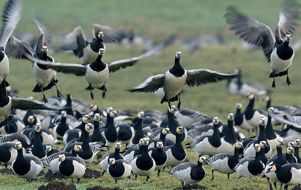 Het gaat voornamelijk om kolganzen, grauwe ganzen en brandganzen. ‘De kolgans heet zo omdat ‘ie een witte kol achter zijn snavel heeft’, zegt Marten. ‘Bij de brandgans valt het zwart-witte verenkleed in het veld op.’ De kolgans en de brandgans broeden tot aan Siberië, de grauwe gans vooral in Scandinavië – maar ook in Nederland.