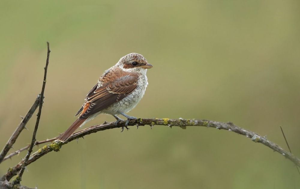 Een kletsnatte grote lijster zat zich te drogen op een paal. Na een paar honderd meter hoorde ik een krassend geluid. Grauwe klauwier, dacht ik.
