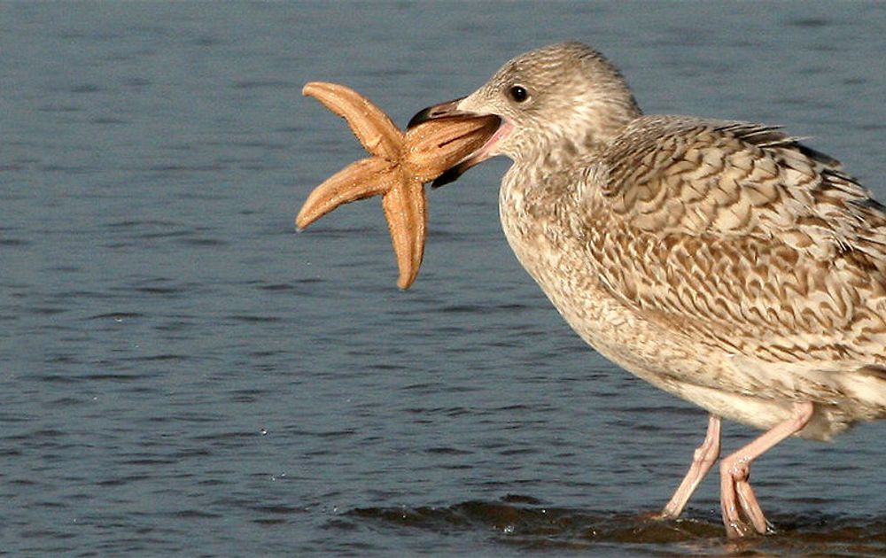 “Ik ga vaak wandelen. Dat doe ik samen met mijn vrouw. Dan gaan we naar de zee en de duinen, natuur die rust geeft. Maar de camera gaat mee. Er is altijd wel wat te zien. We troffen bij Noordwijk deze zilvermeeuw die met die zeester in de weer was.”