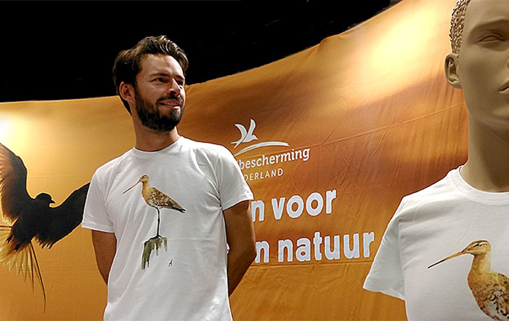 Op het t-shirt van Arjan prijkt een prachtige aquarel van een grutto, onze nationale vogel, gemaakt door kunstenaar Steven Rutgers.