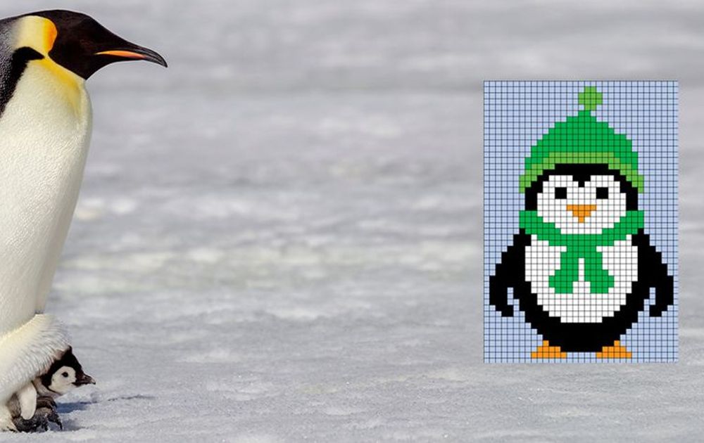Er zijn ontelbare kerst-pixel-art voorbeelden te vinden via internet, maar een leuk begin voor de (klein)kinderen is misschien onderstaande kerstpinguïn. Gewoon hokjes tellen en natekenen. Het enige dat jullie nodig hebben is een ruitjesschrift (5 mm, te koop voor minder dan 1,- euro), viltstiften en een stuk gekleurd karton om de afbeelding op te plakken.