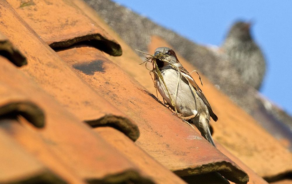 Na een paar dagen nestbouw werd sneller dan verwacht afgelopen zaterdagochtend het eerste ei gelegd en is er tot afgelopen dinsdag elke dag een ei bijgelegd. Hoeveel het er uiteindelijk gaan worden is nog moeilijk te zeggen, maar waarschijnlijk zal het vrouwtje vier tot zes eieren leggen. Het is interessant om te zien dat de huismussen aanvankelijk samen het nest bouwen, later doet vooral het vrouwtje dat. Tijdens de bouw van het nest worden ook al de eieren gelegd. Er zijn huismussen die hun nestkast helemaal volbouwen en andere laten het bij een dun laagje strootjes. Op dit moment behoort dit paartje tot de laatste categorie, maar er wordt nog druk gebouwd aan het nest.
