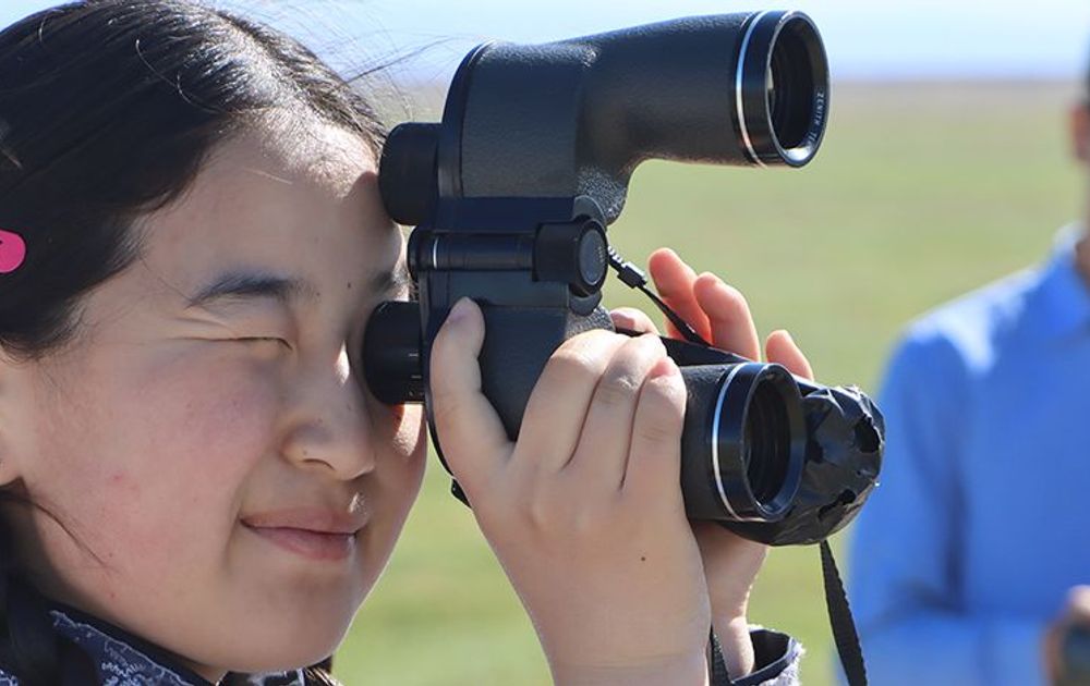 Dit meisje woont in Karoy in Kazachstan. Ook daar zijn kijkers uitgereikt. WWF voert in het Ili-Balkash Natuurreservaat een herintroductieproject uit met tijgers, waarvan er twee vanuit Nederland komen. Gert Polet heeft de verrekijkers meegenomen voor de ecoclub van Karoy.