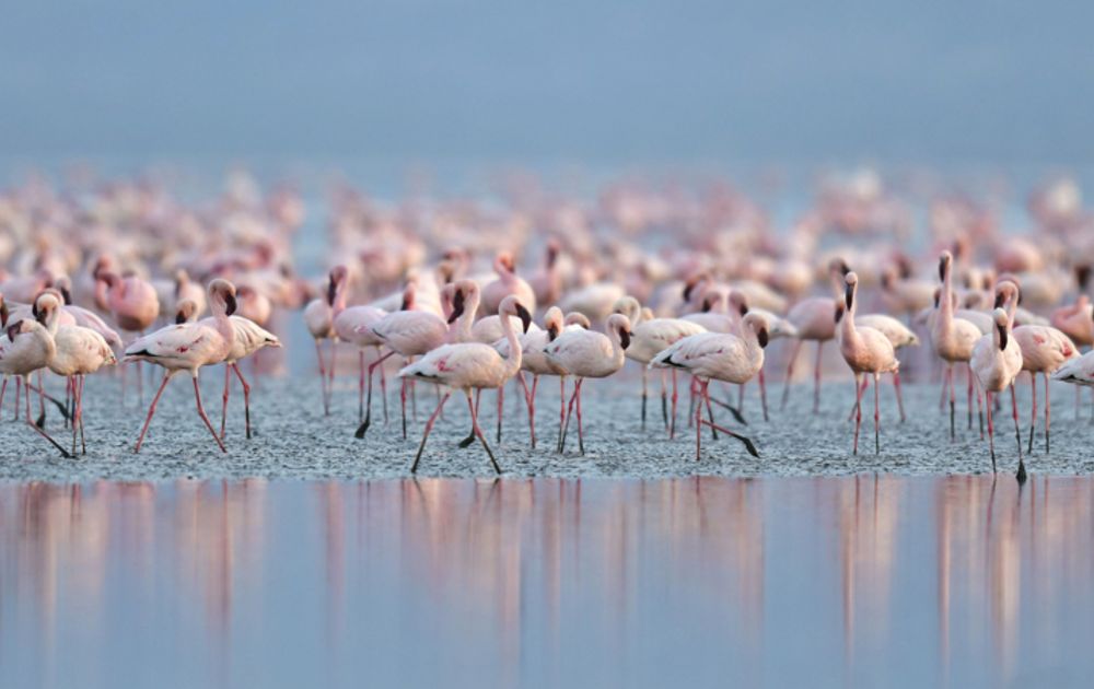 Kleine flamingo’s zoeken voedsel in water dat zo zout is dat het dodelijk is voor de meeste andere vogels. Het zoute Natronmeer in Noord-Tanzania herbergt dan ook de grootste kolonie kleine flamingo’s in de wereld. Ze zijn veel te zien in natuurdocumentaires en genieten een flinke bekendheid.