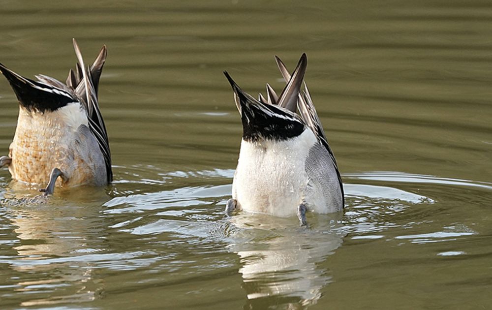Op het water ook de opvallende pijlstaarten en bergeenden, beide veelvuldig met de kop onderwater, de staart pront omhoog.