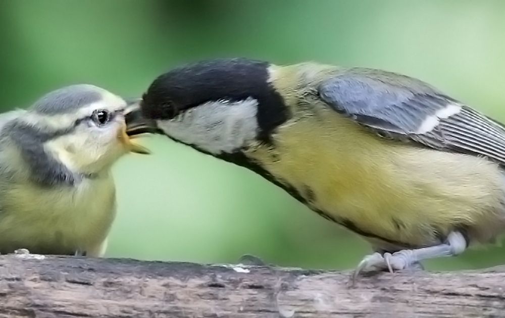 Headerfoto koolmees voert jonge pimpelmees: Hans Bakker