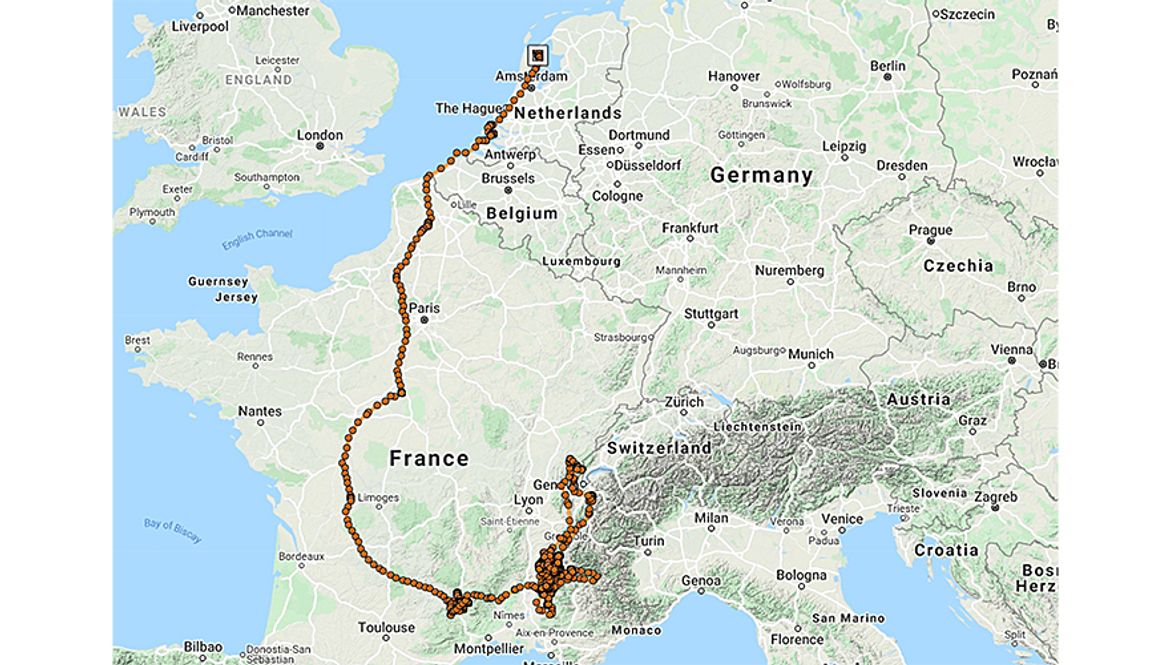 Lammergier Angele die zich doodvloog in Noord-Holland is geboren op 21 februari 2020 in de dierentuin van Liberec, Tsjechië. Op 28 mei 2020 werd de vogel voorzien van een GPS-zender en uitgezet in Baronnies, Haute-Provence, Frankrijk waar al enige tijd een herintroductieproject loopt. De winter spendeerde hij in de Provence en de Vercors, waarna hij vanaf 14 mei jl. ging zwerven. Eerst naar het Centraal Massief, waar hij enkele dagen verbleef. Op 20 mei vloog Angele verder naar het noordwesten. Hij passeerde op 22 mei Parijs, op 23 mei Duinkerken, en vloog daarna ten noorden van Blankenberge (Vlaanderen) even over zee. Op 23 mei bracht hij de nacht door in de polder bij Dreischor en op 24 mei bij Ouddorp, Goeree (ZH), waarna hij naar het noordoosten vloog, over Rotterdam en ten westen van Amsterdam om uiteindelijk in het Robbenoordbos op de avond van 25 mei een slaapplek te vinden. Hier vertrok hij op 26 mei om 08:36u, omzeilde eerst nog tientallen windmolens, waarna hij uiteindelijk toch zijn dood vond, om 09:27u.