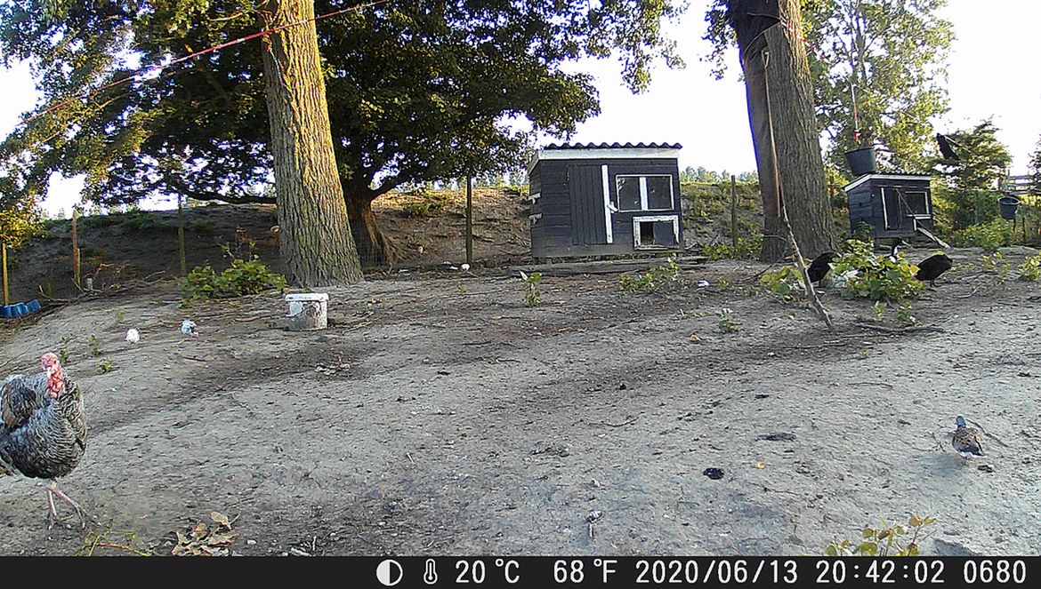 Kenmerkende foerageerlocaties van zomertortels in Zeeland: een erf met hobbypluimvee, overhoekjes in een perceel blauwe bes, een onkruidrijke blauwmaanzaadakker en een graanstoppel. De geschiktheid van deze foerageerplekken voor zomertortels is deels van tijdelijke aard, bijvoorbeeld omdat stoppels snel na oogst worden geploegd. Foto’s: Jenni Vreugdenhil