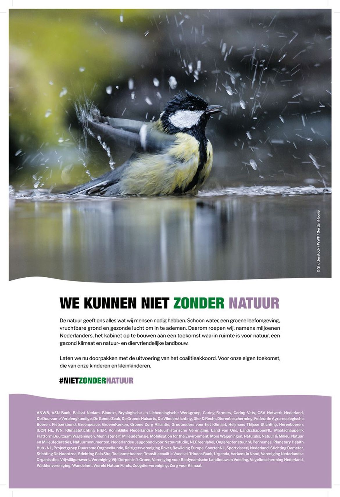 Met een gezamenlijke oproep in meerdere landelijke dagbladen roepen 64 organisaties, waaronder Vogelbescherming, namens miljoenen Nederlanders het kabinet op om te bouwen aan een toekomst waarin ruimte is voor natuur, een gezond klimaat en natuurvriendelijke landbouw en aan de slag te gaan met de uitvoering van het coalitieakkoord. De steun voor dit signaal komt uit alle hoeken van de maatschappij, zoals natuurorganisaties, wetenschappers, verkeersorganisaties, banken, kerken, bouwbedrijven en boeren.