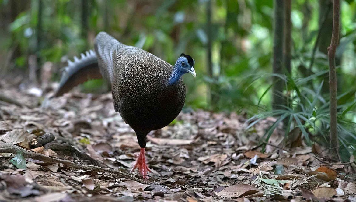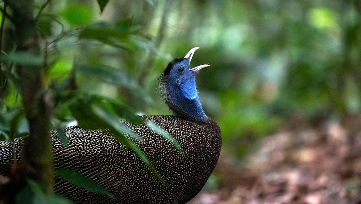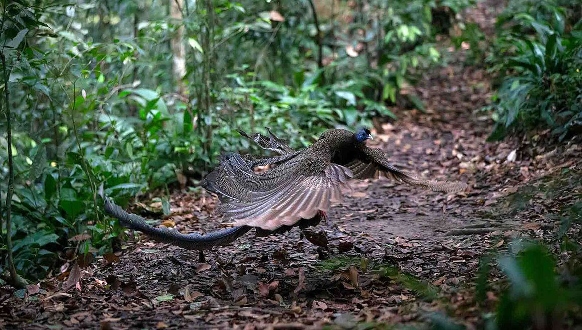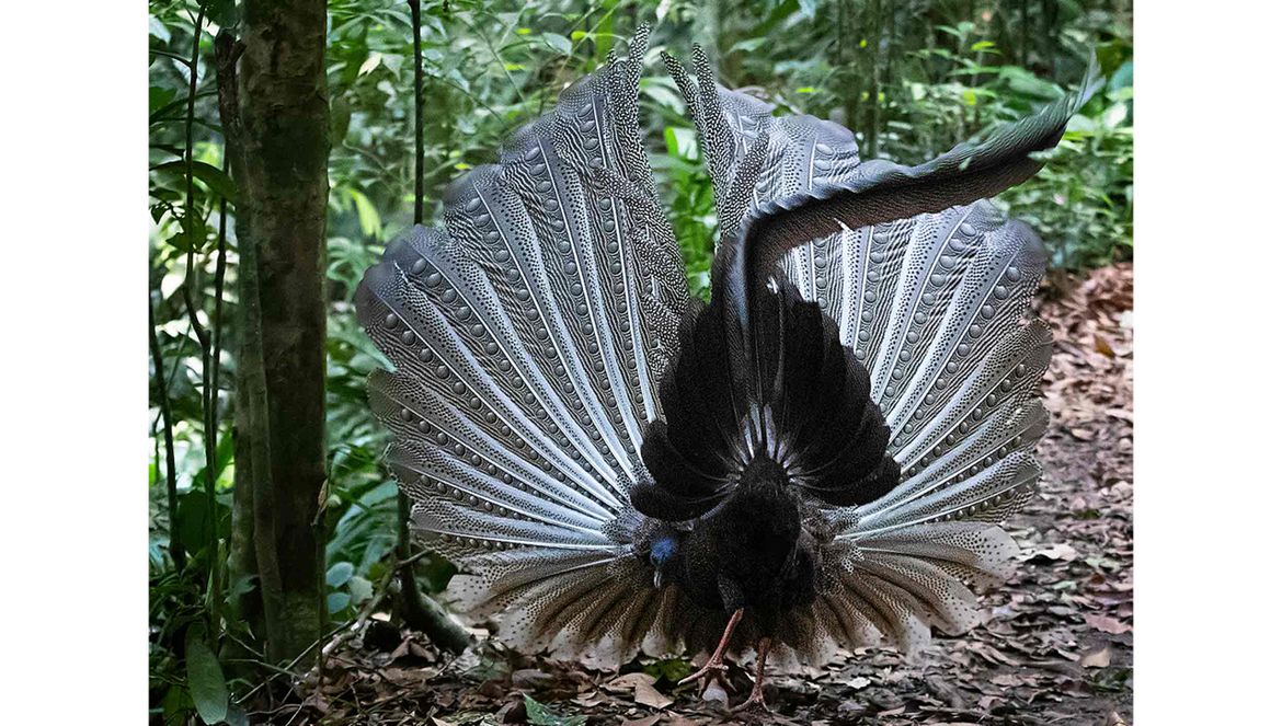 “De baltsende haan spreidde zijn vleugels voor zijn kop en verborg zich achter dit indrukwekkende verenscherm, alsof hij verlegen was. Op de foto’s is goed te zien dat hij stiekem tussen de veren doorkijkt, om te kijken of er een vrouwtje verschijnt. Na een poosje gaf de vogel het op en verdween in het oerwoud.