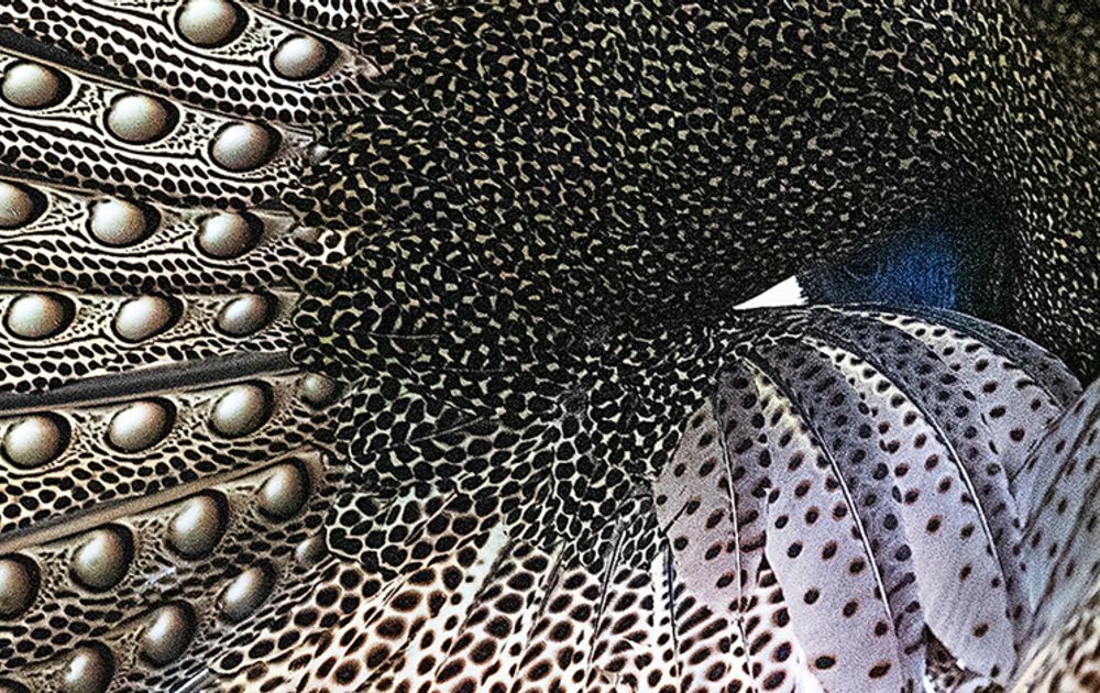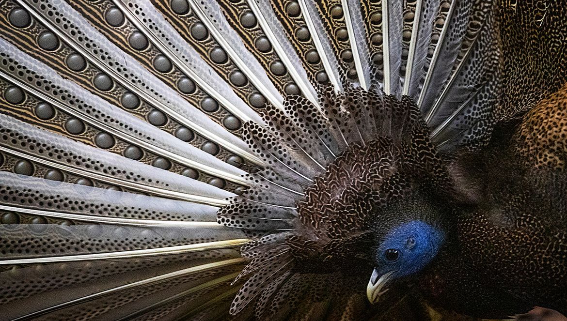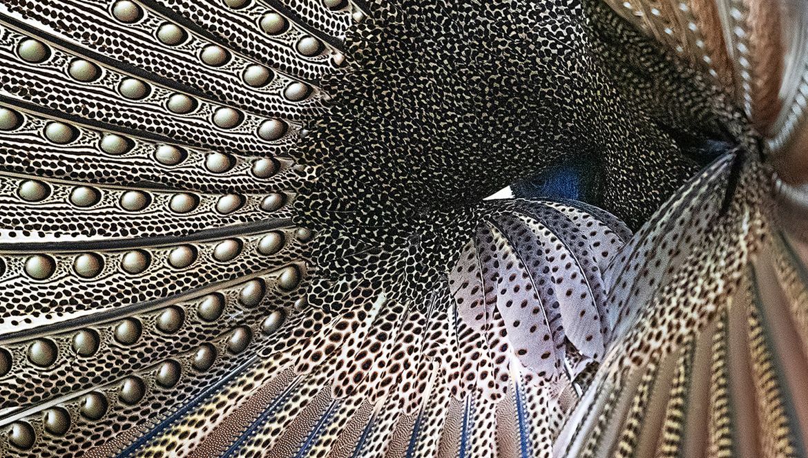 Op de werkelijk waanzinnige foto’s is te zien dat de structuur van de veren met de ontelbare ogen driedimensionaal lijkt. Er zit werkelijk diepte in de vleugeltekening, terwijl het toch echt gladde veren zijn.