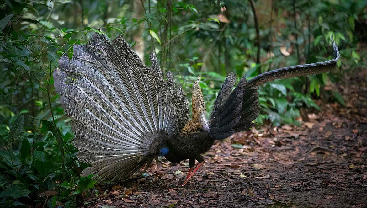 Argusfazanten zijn forse vogels; hanen kunnen tot 15 kilo wegen. Inclusief de lange sierstaartveren meet de man maar liefst 2,35 meter. Jan was enorm onder de indruk van de vogel: “Hij liep enkele meters bij me vandaan en begon luidkeels te roepen WOO-KIA’WAU. Hiermee probeerde hij een vrouwtje te lokken. Vervolgens begon hij de bodem van het bos schoon te maken. Met zijn vleugels verwijderde hij bladeren en takjes. Hij sprong zelfs omhoog en trok bladeren van de takken, om meer zonlicht door te laten. Niets was hem te veel om zijn liefdestheater in orde te brengen.”