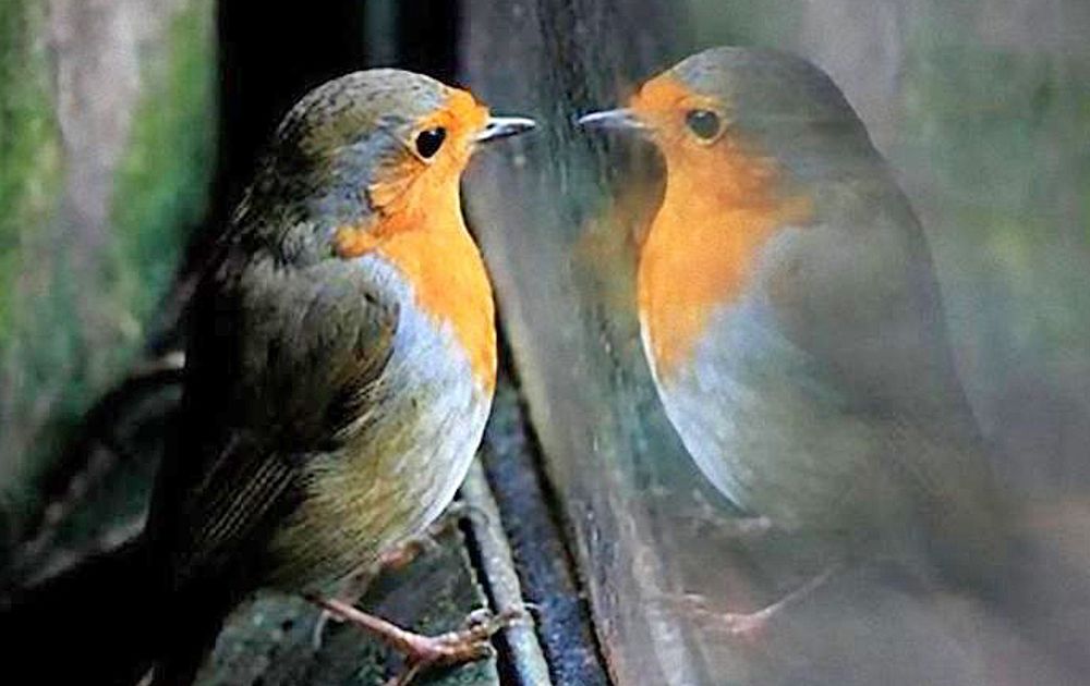 Het is moeilijk voor te stellen, maar vogels herkennen hun eigen spiegelbeeld niet. (Met uitzondering van eksters, zie het kader.) Ze snappen niet dat ze zichzelf zien in een raam of spiegel en denken dat hun reflectie een andere vogel is. En in het broedseizoen, is een andere vogel al snel een indringer in hun territorium. Die moet weg.