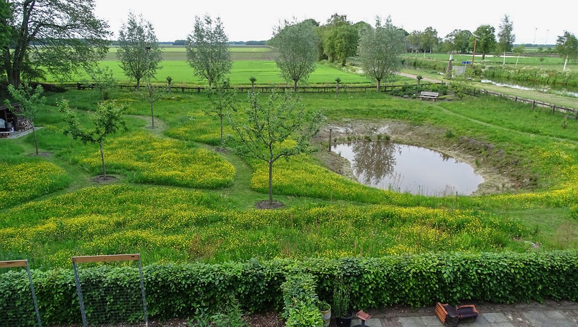 Hun trots is de paddenpoel, die ze in 2015 lieten graven. “Oorspronkelijk was hier een schapenwei. We hebben de grond af laten graven en besloten om niets te planten of te zaaien. Het jaar erop werden we verrast door een grote variatie aan wilde planten en bloemen. Fantastisch! Zo kwam er spontaan cichorei op, waar de putters dol op zijn. En dagelijks komt de ijsvogel op bezoek.”