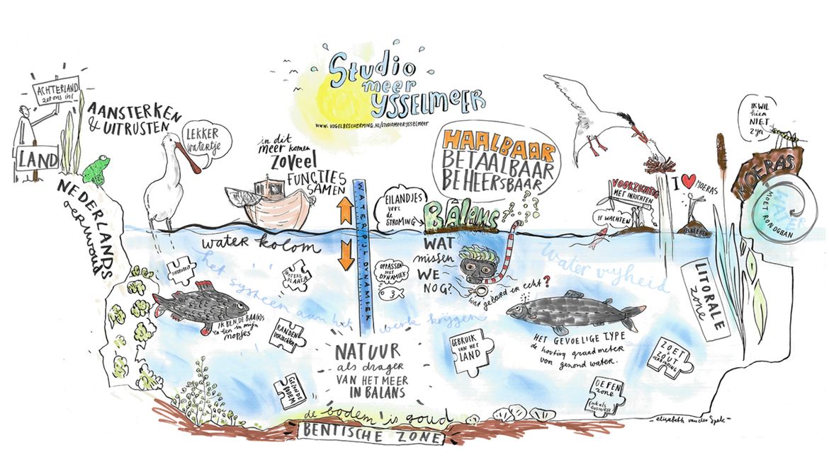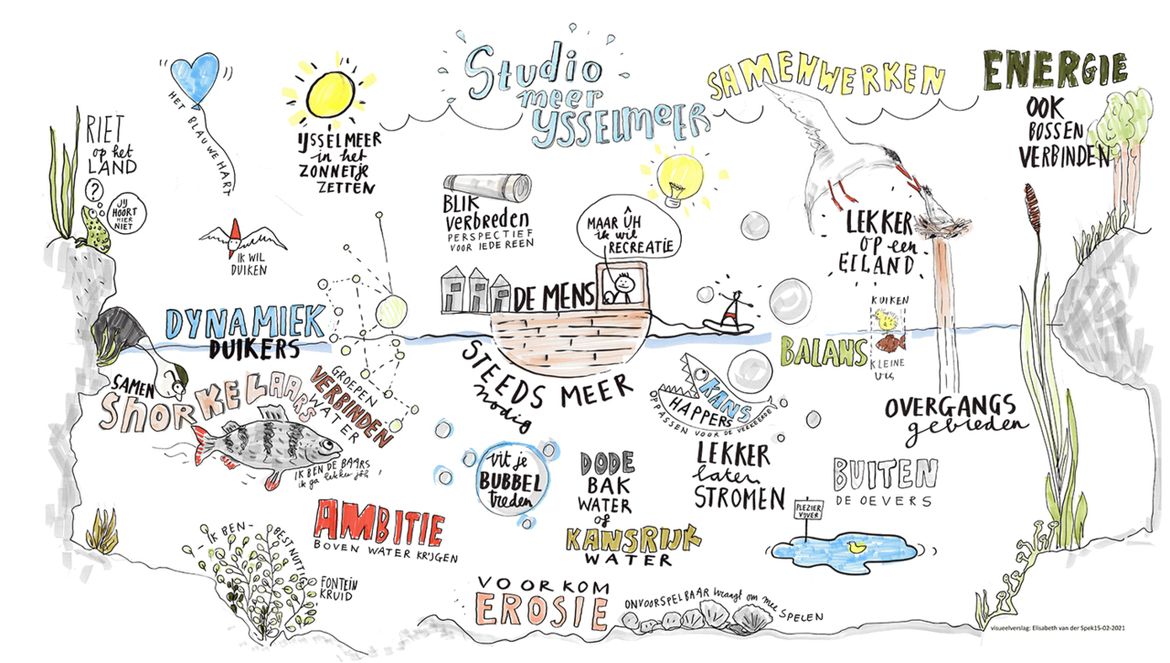 In drie webinars gingen we het gesprek aan met echte IJsselmeer experts. Deelnemers konden via de chat vragen stellen en hun mening geven. De sprekers wisselden we af met korte vlogs van Camilla Dreef (onderzoeker en ambassadeur Vogelbescherming Nederland) en Marco Kraal (visexpert Sportvisserij Nederland) die een aantal kenmerkende vogels en vissen uitlichtten. We sloten af met een leuke quiz en er was een sneltekenaar aanwezig die een creatieve samenvatting van de webinars maakte.