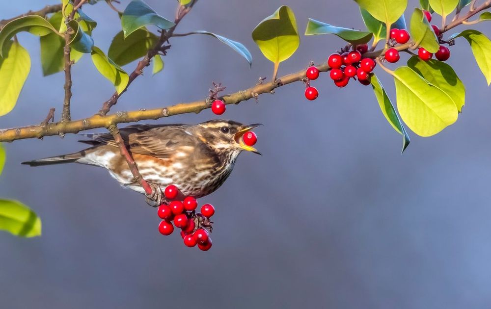 Eenmaal thuis natuurlijk toch proberen om tussen alle merels de beflijster terug te vinden. En ja hoor, na wat speurwerk vond Karen hem in een vlier achter in de tuin. Een prachtige man beflijster! Wat een geweldige tuinsoort! De dag erop was hij vertrokken, maar zat de tuin vol met koperwieken die de bessen in de hulst hadden gevonden. Naast al dat lijstergeweld zag je de zwartkoppen bijna over het hoofd, maar ook zij pikten een graantje mee.