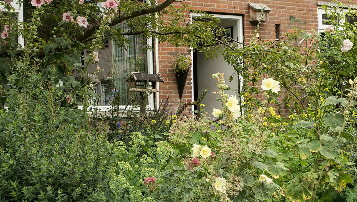 Een doodgewone middenwoning vlakbij het centrum van Zierikzee. Met een klein voortuintje en dito achtertuintje. Bij elkaar opgeteld niet meer dan 40 m2. Jannie Timmer wist deze twee postzegeltjes om te toveren tot twee ruige groene eilandjes, waar planten, insecten én vogels zich welkom weten.