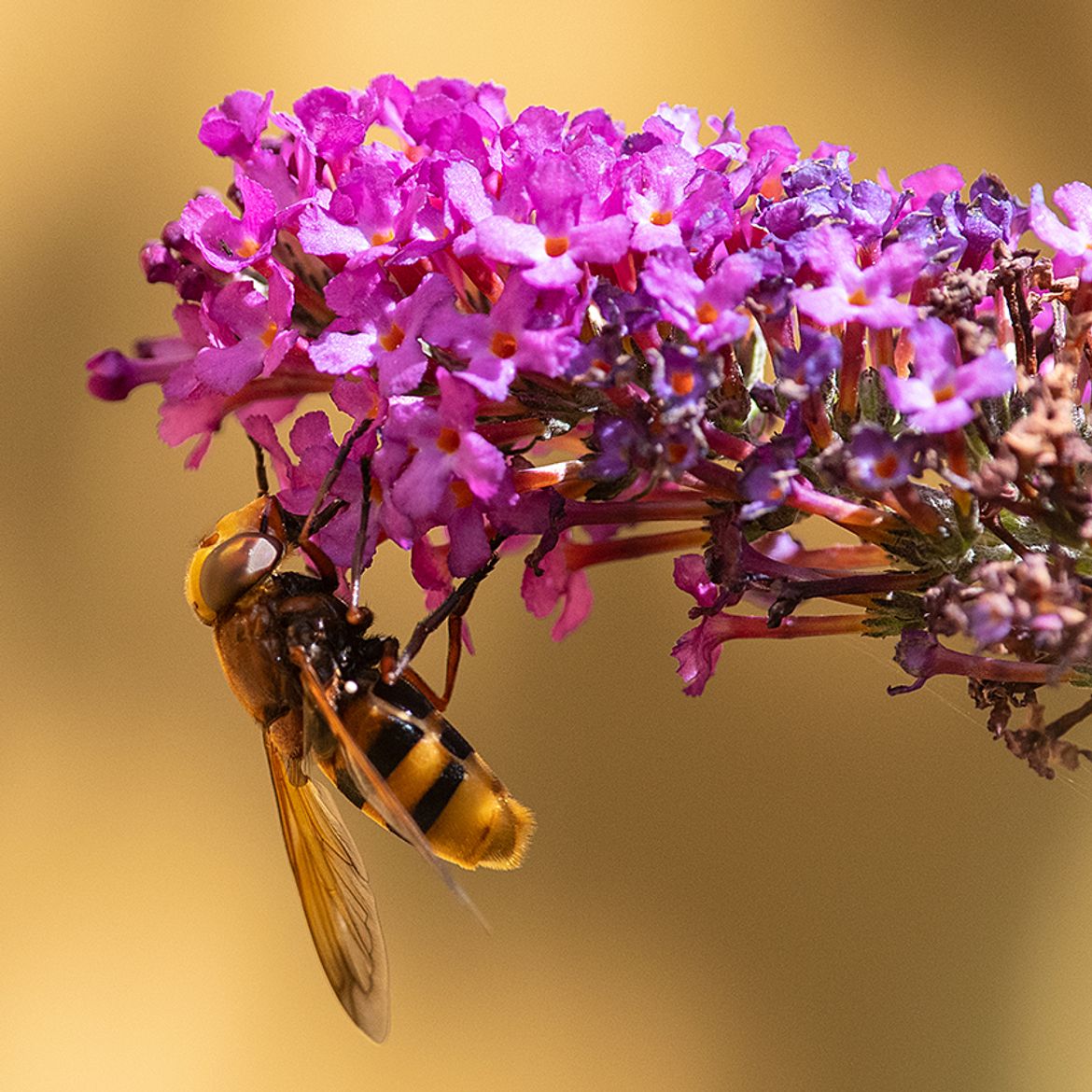 Zomers krijgen haar vlinderstruiken en bloeiende planten bezoek van atalanta, dagpauwoog, klein koolwitje, kolibrievlinder en veel wilde bijen, tuinhommels en allerlei soorten zweefvliegen. De hoornaarzweefvlieg ofwel stadsreus is geen alledaagse klant.