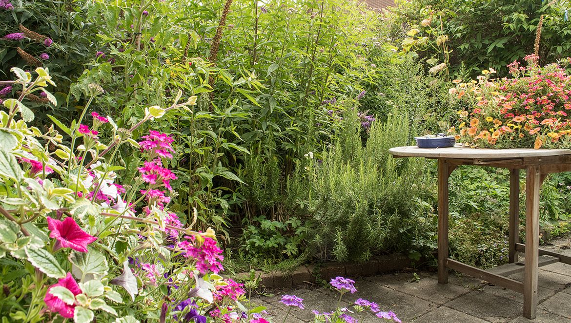 Haar achtertuin is net zo aantrekkelijk voor vogels en andere beestjes. Jannie: “Het onkruid of liever gezegd de wilde planten groeien tot boven mijn hoofd. Helaas hebben we geen plaats voor een vijver, maar de waterschalen compenseren dat.”