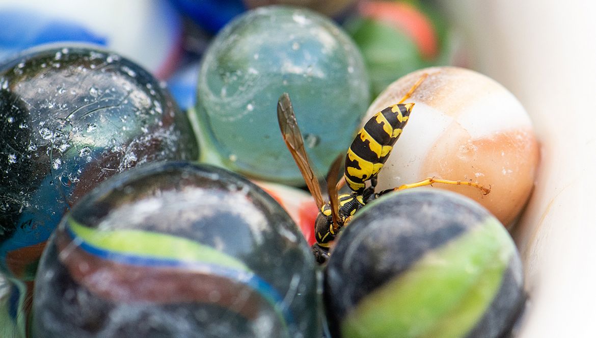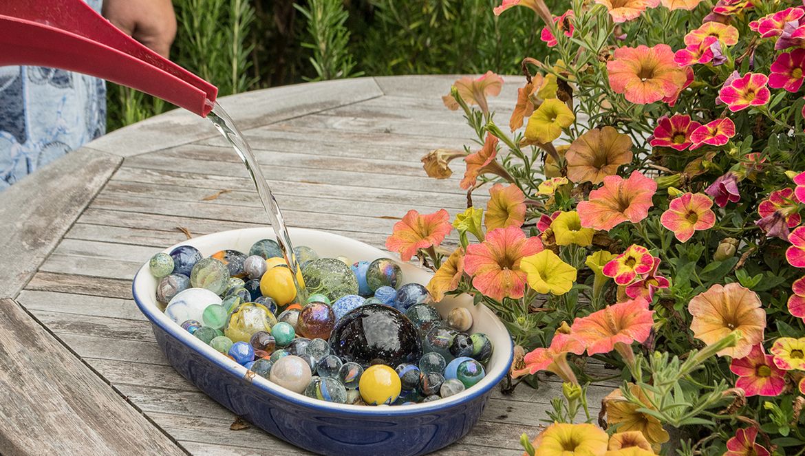 Hoewel Jannie een enthousiast vogelfotograaf is, stort ze zich óók vol overgave op bloemen en insecten. Een schaal gevuld met knikkers trekt onze aandacht. Jannie vult deze met water als drinkplaats voor bijen, wespen en hommels. Dat kleine spul kan er door de knikkers gemakkelijk bij.