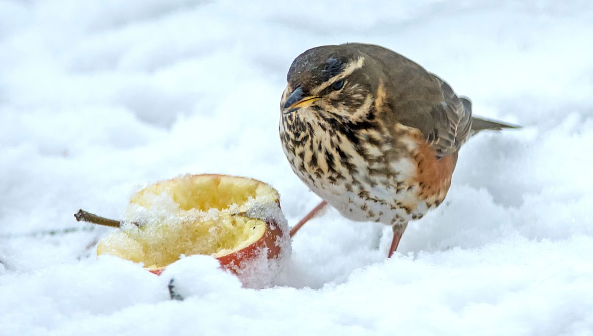 Lijsterachtige zoals merels, koperwieken en kramsvogels zijn dol op rotte appels. In de winter kun je deze wintergasten geen groter plezier doen dan met wat aangeboden fruit. Jannie vertelt: “Ik koop bij de plaatselijke tuinder appelmoesappels – die zijn het goedkoopst – met de kist tegelijk. In een strenge winterperiode gaat er wel een kist per week op. Ik snijd de appels altijd over de helft, zodat de vogels ze gemakkelijker kunnen eten.”
