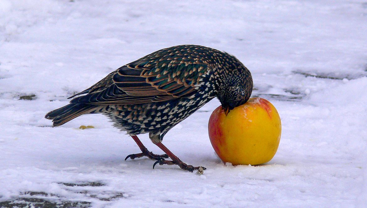 Behalve lijsterachtige lusten ook spreeuwen wel een appeltje.