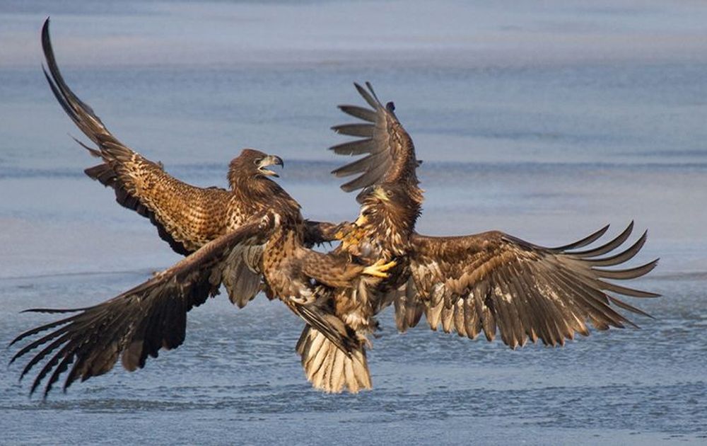 Onderling bakkeleien roofvogels af en toe ook flink. Zeearenden bijvoorbeeld. (Jonge) mannetjes kibbelen over -hoe kan het ook anders - vis of het alleengebruik van goed viswater. Kan je het je voorstellen, twee ‘vliegende deuren’ met elkaar in de clinch? (Zo worden zeearenden door hun formaat genoemd: de spanwijdte van de vleugels is vergelijkbaar met de hoogte van een deur.) Soms vergrendelen ze hun klauwen en maken indrukwekkende manoeuvres in de hoop de ander uiteindelijk te verjagen.