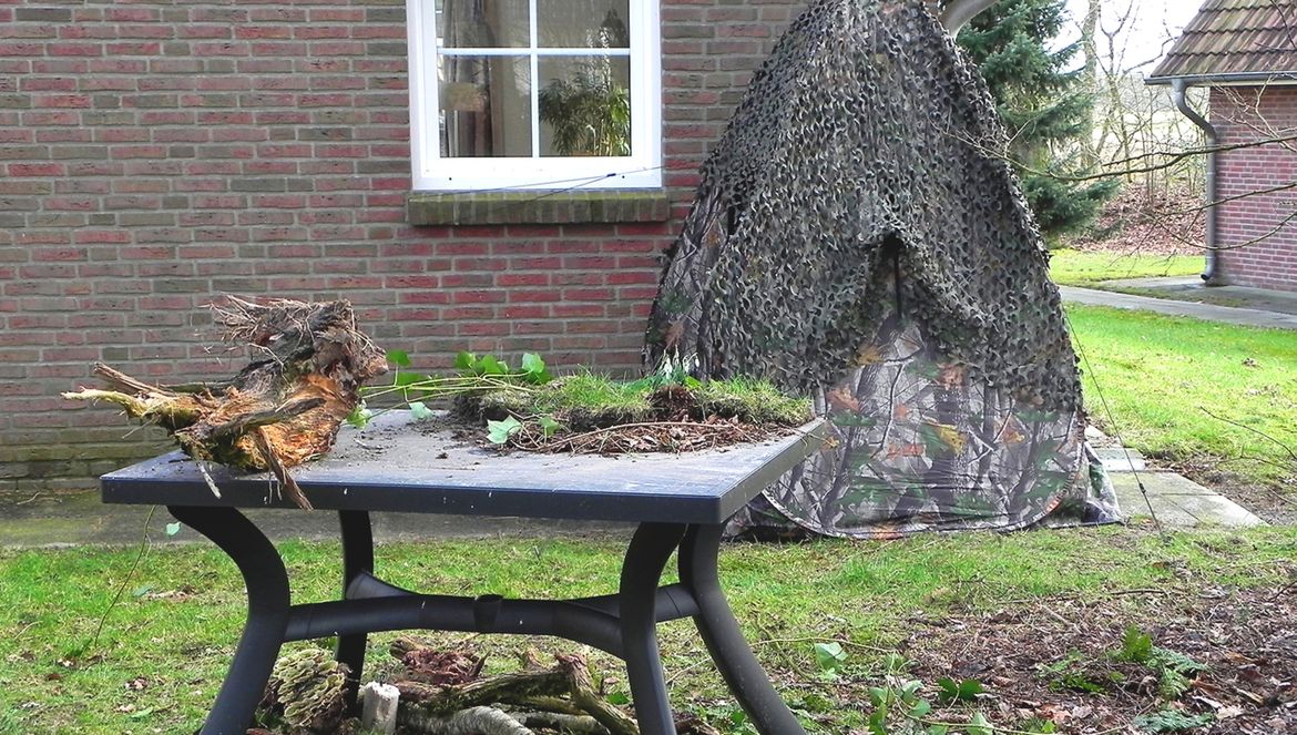 Een vogelfoto wordt mooier als er ook zorg is besteed aan de achtergrond en omgeving. Fotografeer je vanuit een schuiltent of huiskamer, probeer dan vogels te lokken. (Zie verderop in deze les). Om de foto verder ‘aan te kleden’ creëer je een setting die er leuk uitziet. Je bouwt als het ware een fotostudio in de vrije natuur. Gebruik decoratieve takjes, een boomstronk, een pol mos of een vijver. Kortom, alles wat je mooi vindt. Houd rekening met de stand van de zon en een rustige achtergrond. Fotografeer vogels op ooghoogte. Je kunt daarvoor een kuil graven en er in gaan zitten; je kunt ook een picknicktafel gebruiken en de setting op hoogte maken.