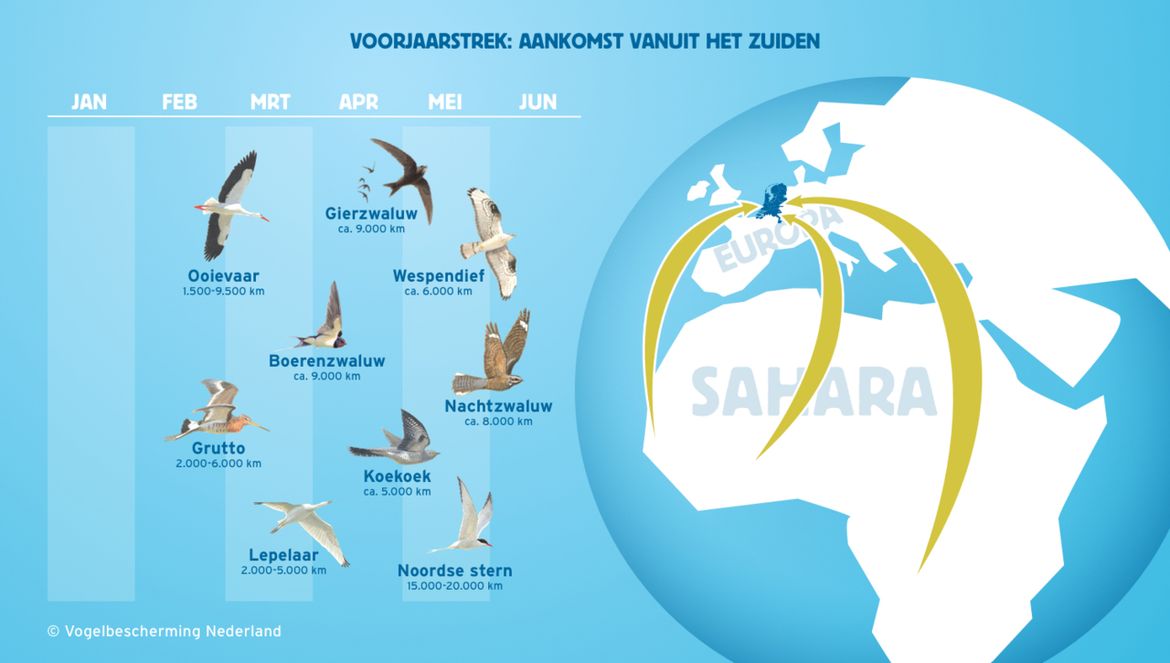 Langeafstandstrekkers als spotvogel, zomertortel en wielewaal komen later aan vanuit Afrika. Dat hoeft niet altijd, want boerenzwaluwen trekken heel ver weg, maar zijn relatief vroeg terug in de Nederlandse boerenschuren waar ze broeden. Noordse sterns maken het wel heel bont. Zij brengen de winter door rond Antarctica, tot Australië aan toe!