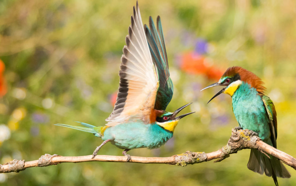 Een en al exotische pracht. De voorzijde lijkt op een vroeg schilderij van Mondriaan. Als de vogel zich omdraait zien we het complete schilderspalet van Van Gogh. Nu begrijpen we dat hij ook regenboogvogel genoemd wordt. Zo’n veertig bijeneters dansen door de lucht om bijen, libellen en zelfs een distelvlinder te vangen.