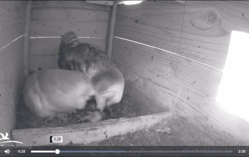 Man lijkt dit niet helemaal te begrijpen en ziet gewoon dat er nog voedsel ligt wat niet wordt opgegeten. Niet gek dat hij het dan wel lust; hij moet heel hard werken om zijn gezin te voeden, dus het is belangrijk dat hij in goede conditie blijft. Het opvoeden van kuikens is een topsport waar, zeker in de beginfase, beide ouders echt voor nodig zijn. Als de muizenaanvoer op peil blijft zullen we zien dat vrouw kerkuil steeds meer tijd besteedt aan voeren naarmate er meer kuikens komen, tot meerdere uren per dag aan toe.