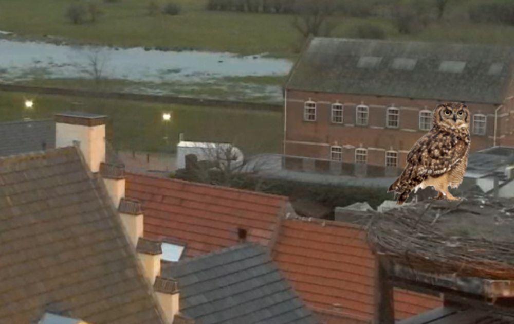 De Oehoe komt hier in Limburg al langer voor, sterker nog, ik heb een screenshot van een poosje geleden. Dit was ook in de schemer (zie straatverlichting) en ik schrok mij een hoedje, want er zat in een keer een Oehoe op het nest.
