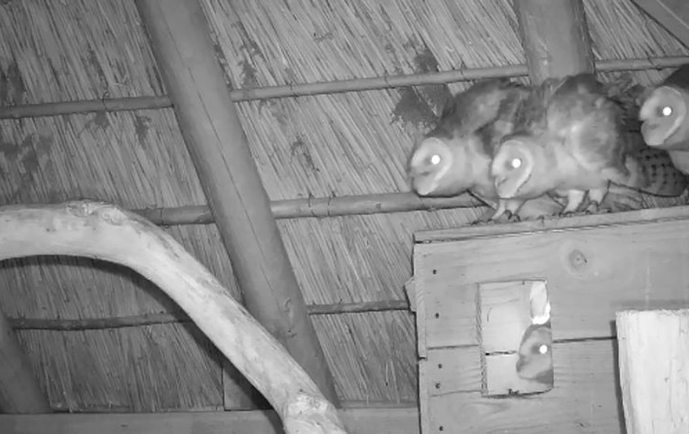 De afgelopen tijd kon je al regelmatig zien dat de kerkuilen wat onrustig werden van al die bosuilactiviteit om het erf. Zowel de jongen als de volwassen kerkuilen waren erg waaks als de piepjes te vaak of te dichtbij te horen waren. Ondertussen kon ik met een nachtcamera precies volgen waar de bosuilen op dat soort momenten zaten; vaak vlak naast de hooiberg of op het rieten dak. Dus die waakzaamheid was bepaald niet overdreven.