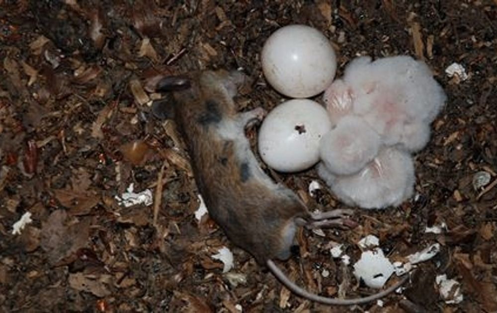 Foto: 2 pas uitgekomen jongen, 1 aangepikt ei en 1 nog gesloten ei. Bij steenuilen komen de eieren in een nest doorgaans binnen een tijdsbestek van 15 uur uit. De bosmuis ligt als prooi op voorraad.