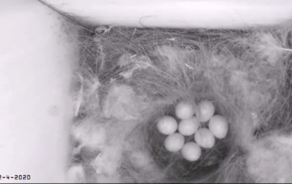Als het ineens warm wordt willen koolmeesvrouwen ook al eens gaan broeden voordat het laatste ei is gelegd. Ze krijgen dan als het ware haast en beginnen alvast, zodat de embryo’s zich door de warmte kunnen gaan ontwikkelen. Het was dus nog even spannend of mevrouw koolmees er vandaag een ei bij zou gaan leggen, maar nee, ze houdt het bij acht eieren. En dat is een heel mooi en normaal aantal voor een koolmees. Verder zien we dat de eieren zichtbaar blijven als de vrouw de nestkast verlaat. Voorheen bedekte ze de eieren met haren. Het openlaten van de nestkom is ook een teken dat het broeden is begonnen.