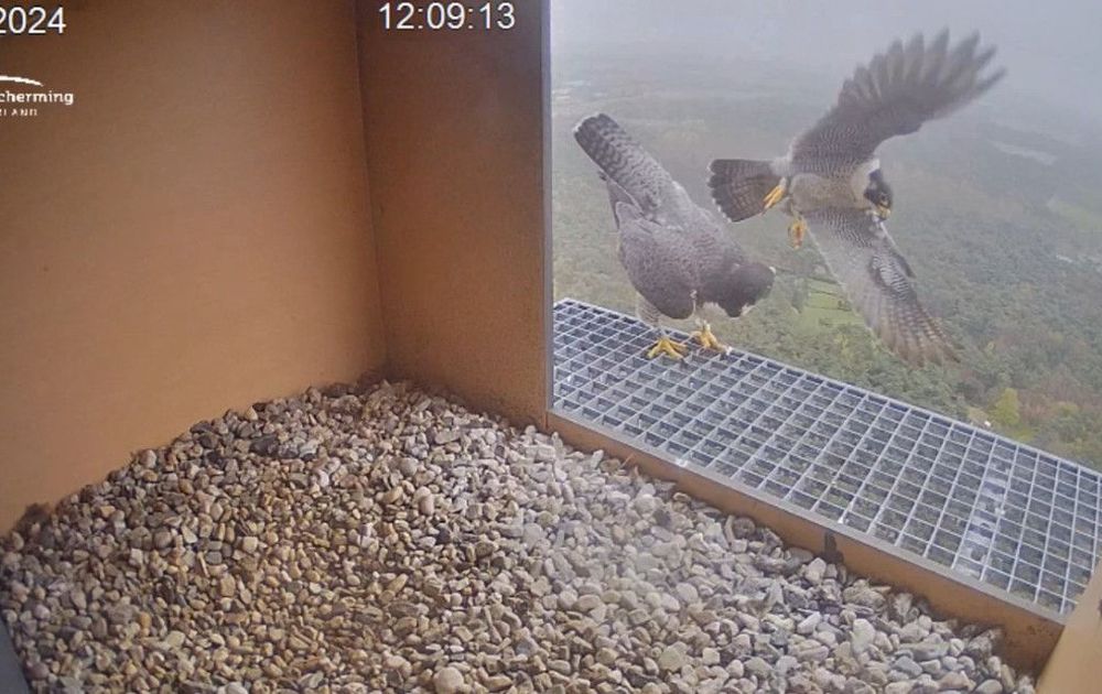 We zagen dat deze twee een hele goede paarband hebben opgebouwd het afgelopen jaar. En zij baltsten en zij baltsen nog steeds. Man BUS brengt prooitjes, Vrouw 4NL grist ze uit zijn snavel, ze paren veelvuldig en komen in hun kast. 4NL brengt daar de nachten door en beiden schrapen in de kuil daar in het grind. 4NL pikt ook regelmatig tussen de steentjes en in de hoeken naar eventueel ongedierte en zij ‘hangt ’ regelmatig bij de kuil alsof er een ei komt. De foppert. Ook ligt ze soms te proefbroeden.