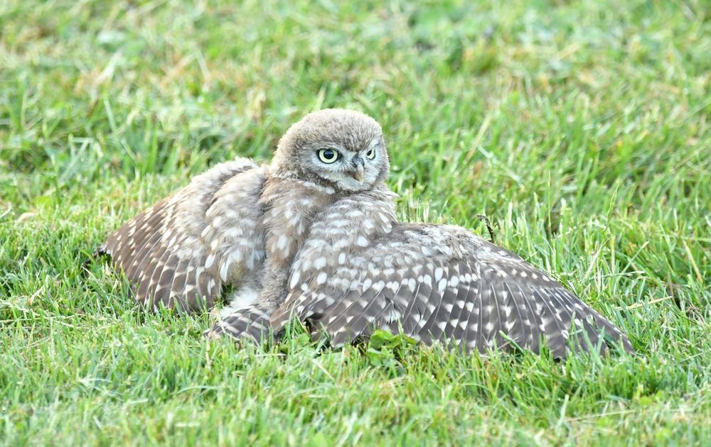 Dan gaan de vleugels wijd. Niet om bruin te worden, dat zijn steenuilen toch al, maar om vervelende beestjes kwijt te raken. Die krijgen het op den duur te warm en verlaten het verenpak.